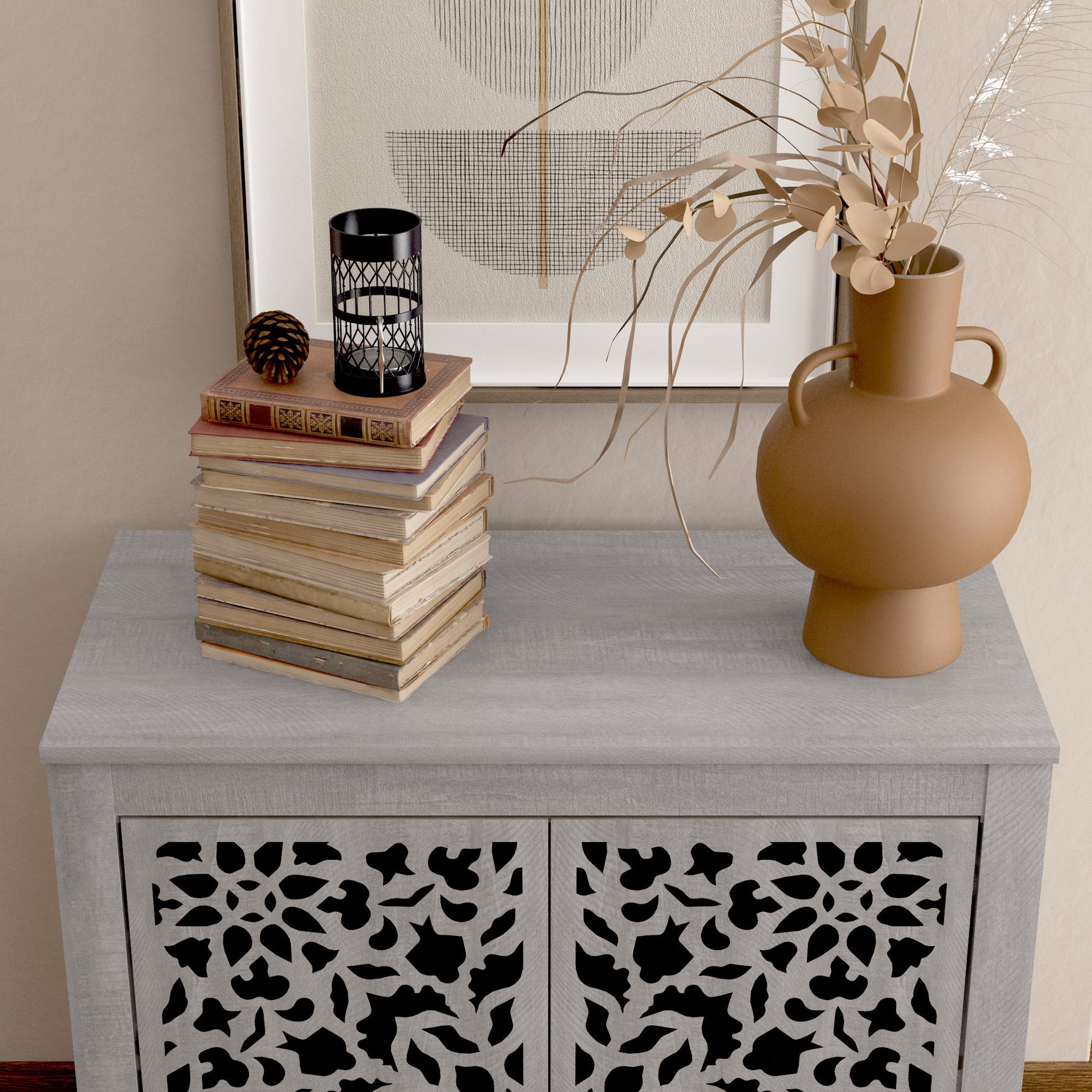 The Galano 2-Door Accent Cabinet brings a warm and inviting touch to any room with its detailed cut-out doors and natural wood grain finish. Sized at 30.9" W × 15.8" D × 30" H, it fits comfortably in living rooms, entryways, or dining areas while providing helpful concealed storage. Behind the two doors are adjustable shelves that let you customize space for books, décor, or everyday items you want to keep neatly tucked away. The top surface supports up to 18 lbs, making it a simple spot for plants, frames, or small decorative pieces. Made from manufactured wood with a finished back, this cabinet blends easily into traditional and transitional homes, creating a clean and organized feel without taking up too much room.