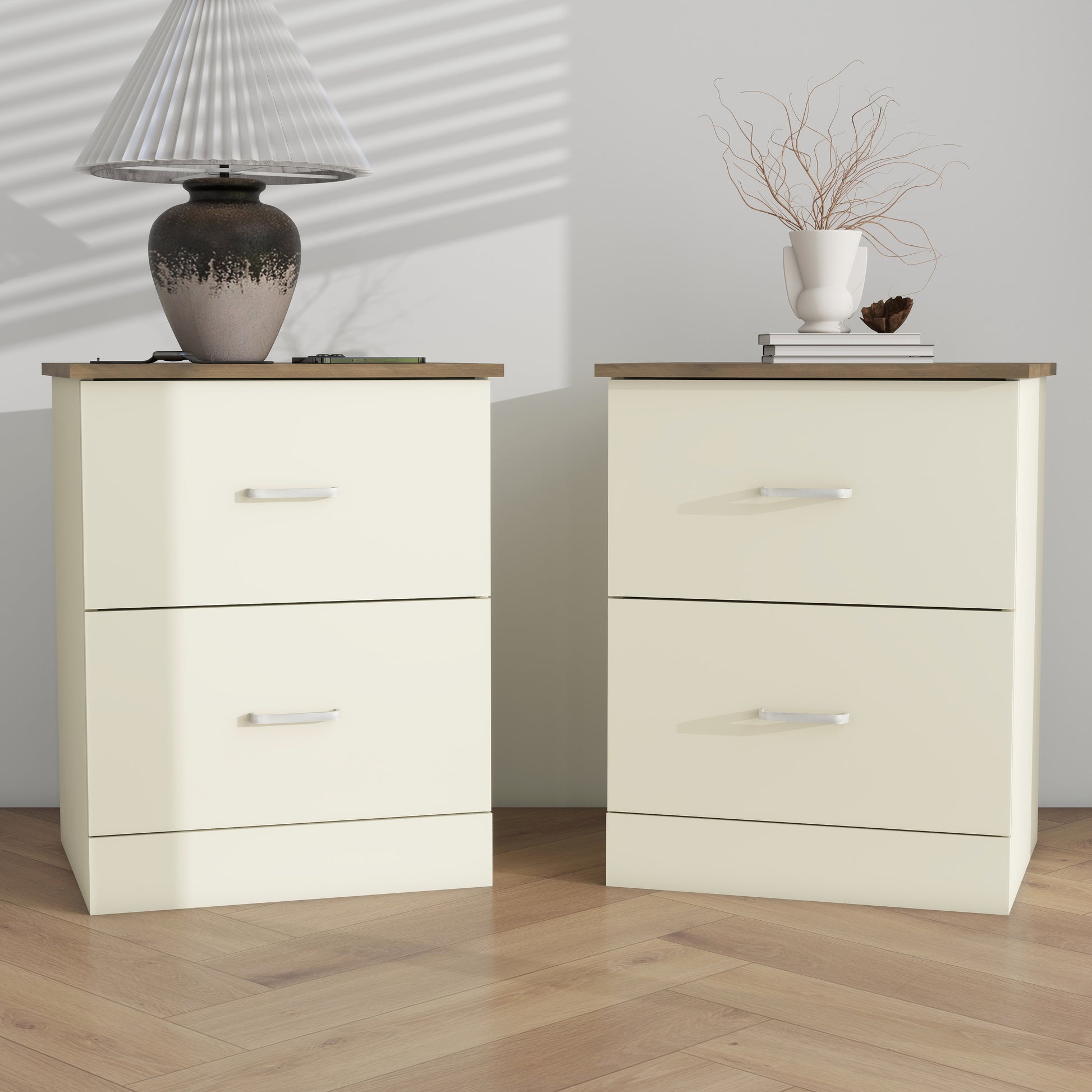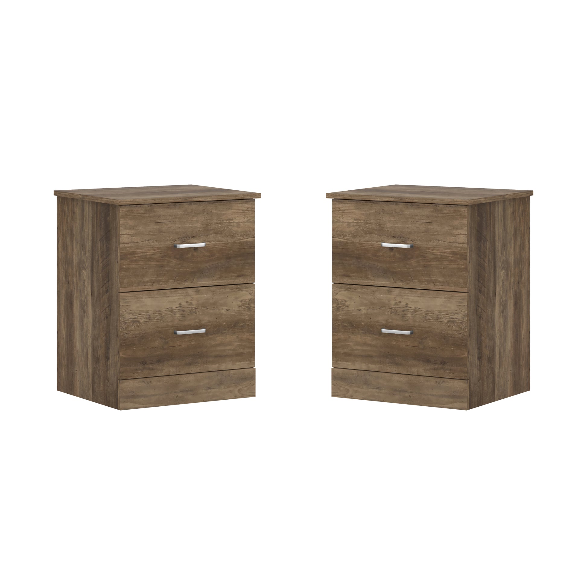 Bring coordinated and practical bedside storage to your room with this set of two modern nightstands from Galano. Each nightstand features a clean rectangular silhouette with a warm wood-grain finish that pairs easily with many bedroom styles. Two smooth-glide drawers provide enclosed storage for items like chargers, books, and personal essentials, while the metal C-shaped handles add a simple and modern detail. The top surface supports up to 11 lbs, offering room for a lamp, alarm clock, or décor. Measuring 18.7" W × 15.7" D × 23.7" H each, these nightstands fit well beside most beds, making them ideal for primary bedrooms, apartments, or guest spaces. Built from durable manufactured wood and finished on multiple sides, they offer a polished look and dependable everyday use. Assembly is straightforward with the included instructions, allowing you to create a comfortable and well-coordinated bedside setup with ease.