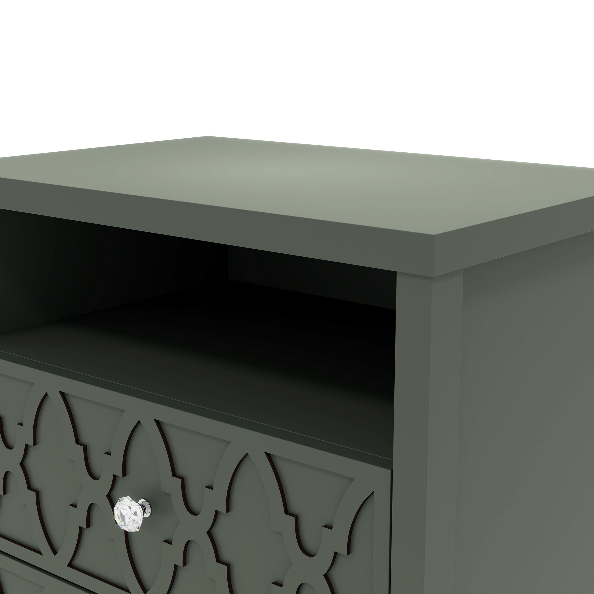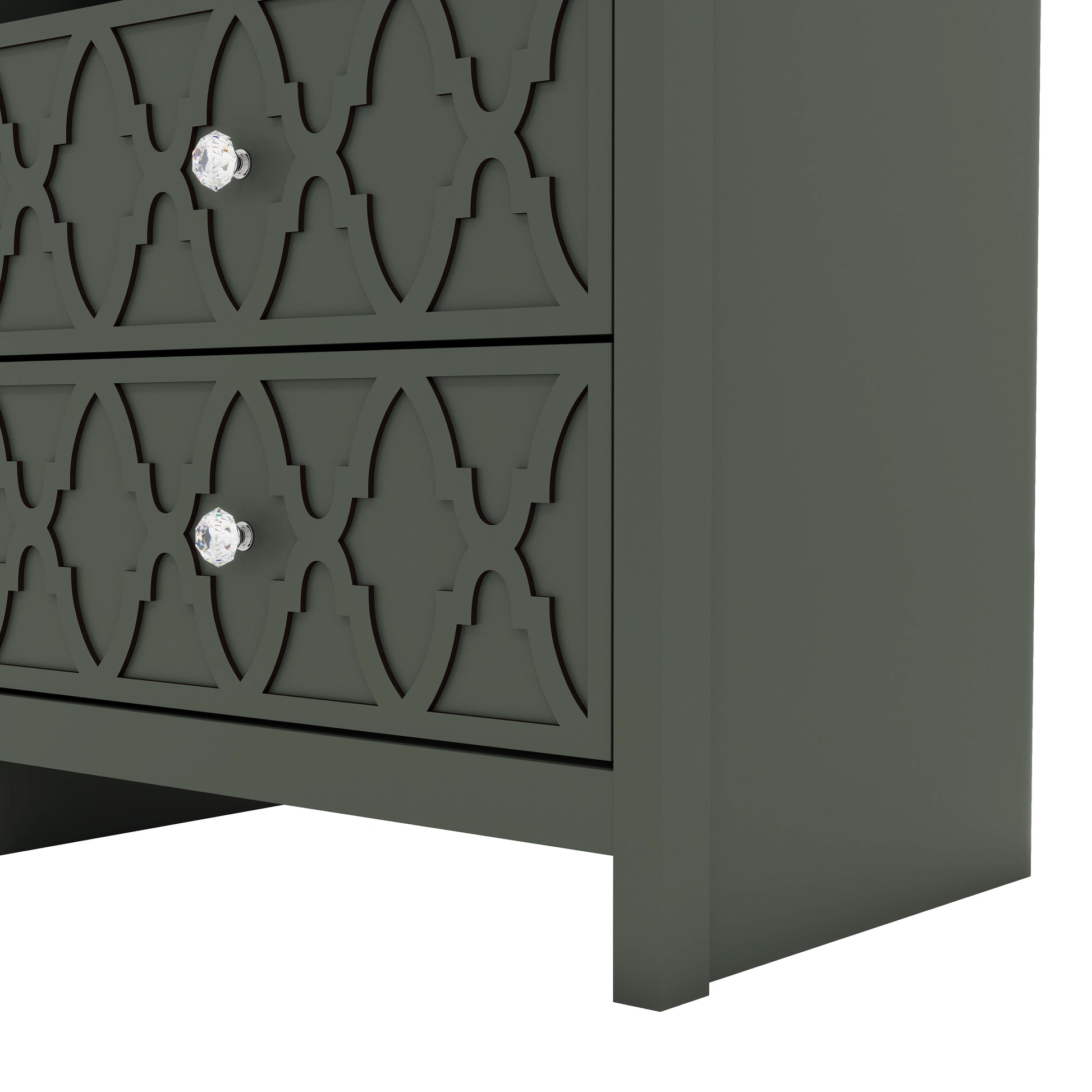 Bring simple style and practical storage to your bedroom with this Galano 2-Drawer Nightstand, designed to fit comfortably beside any bed. Its 22.8" W × 15.7" D × 26.8" H size offers a balanced profile, while the smooth metal-glide drawers keep essentials like glasses, chargers, and bedside items tucked neatly away. An open shelf adds extra room for books, small baskets, or display pieces, making it a helpful addition for both small and spacious bedrooms. The decorative trellis-style drawer fronts add a subtle touch of pattern that blends easily with modern, transitional, or traditional décor. Built from durable engineered wood with a clean black finish, this nightstand features a 24 lb tabletop capacity and 11 lb support in each drawer and shelf, giving you everyday functionality that suits apartments, guest rooms, or primary bedrooms. Clear instructions are included for a smooth assembly experience.
