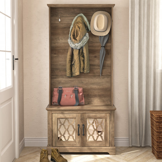 GALANO Hall Tree with Bench and Mirror Door Storage in Knotty Oak 31.3" W x 15.7" D x 68.3" H
