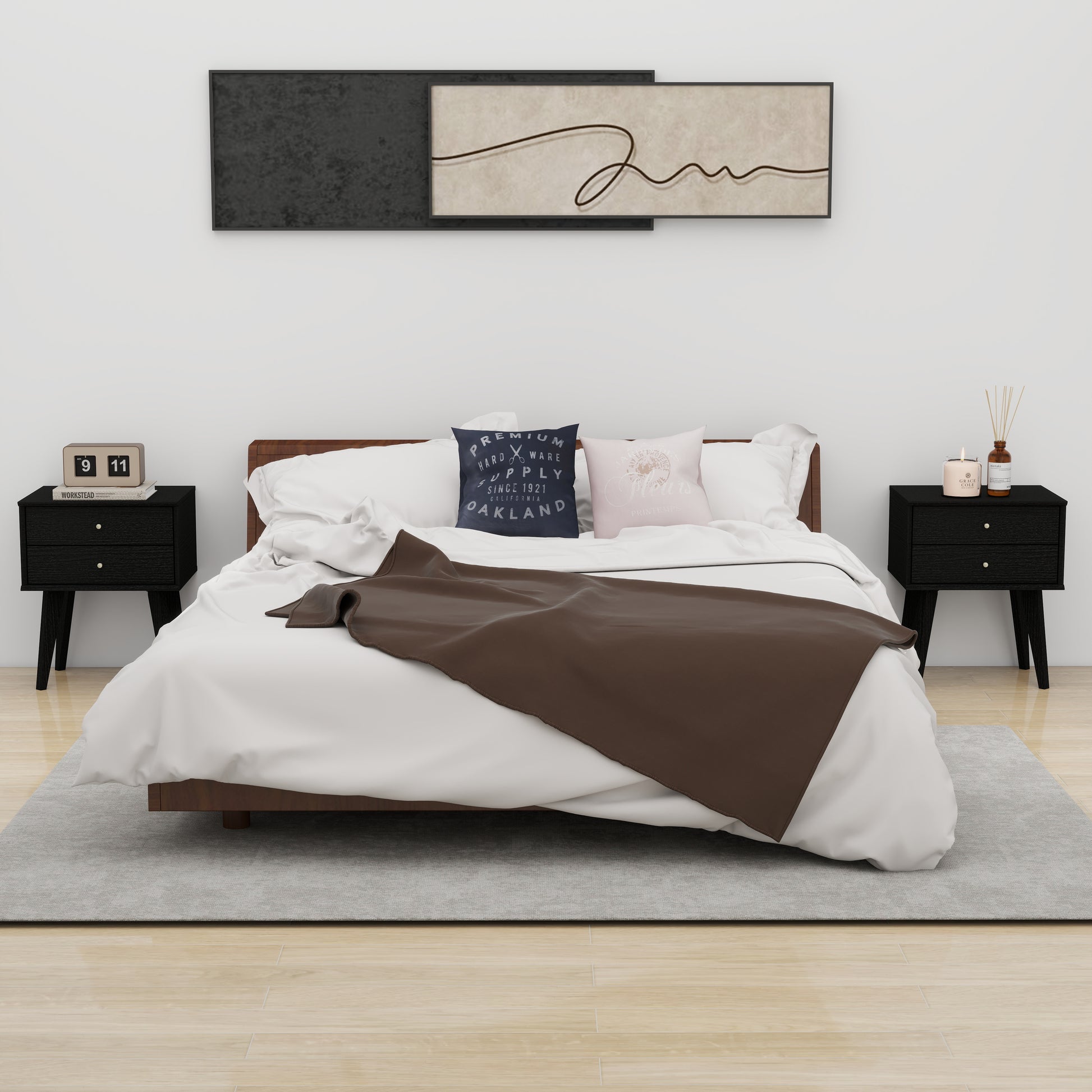 Bring a warm, modern touch to your bedroom with this Galano 2-Drawer Nightstand, sized at 18.1" W × 14.2" D × 22.1" H for a balanced fit beside any bed. The clean rectangular shape pairs with angled legs for a nod to mid-century style, while the natural wood-grain finish adds a cozy, welcoming feel. Two drawers glide smoothly on metal hardware, giving you a comfortable spot to store glasses, chargers, and bedside essentials. The tabletop supports 8.8 lbs for a lamp or décor, and each drawer holds 4.4 lbs to support everyday storage. Metal handles add a simple, polished detail that blends easily with many bedroom looks—from contemporary to minimal spaces. Lightweight but sturdy, this nightstand is ideal for apartments, guest rooms, or primary bedrooms. Assembly instructions are included to help make setup simple.